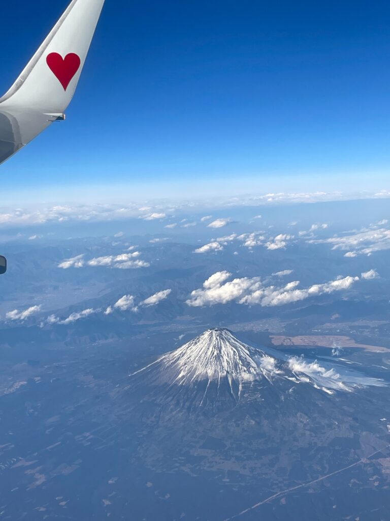 飛行機の窓から見えた富士山がとてもきれいで、思わず写真を撮りました。